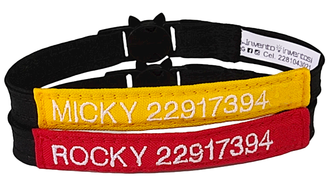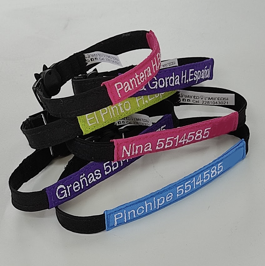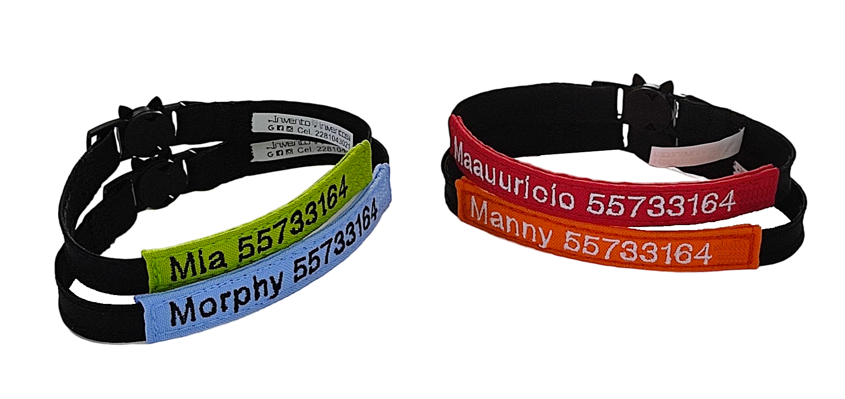 Collar ÚNICO en el mercado hecho especialmente para gatos: personalizado con datos de la mascota, teléfono del dueño, ancho de 1 cm. que evita que le estorben en el cuello y un broche ESPECIAL que se abre si el gato se atora. Esto evita ahorcamientos.