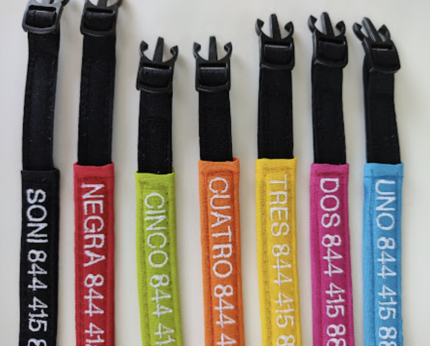 Protección para su mascota en un hermoso, útil y único collar identificador de tela personalizado con nombre de la mascota, número de contacto y broche especial que se zafa en caso de atoramiento.